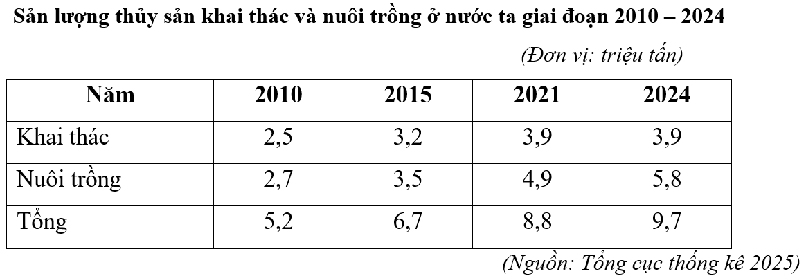 Căn cứ vào bảng số liệu trên, hãy cho biết tỉ trọng sản lượng thủy sản nuôi trồng trong tổng sản lượng thủy sản của nước ta năm 2024 so với năm 2010 tăng thêm bao nhiêu phần trăm (làm tròn kết quả đến một chữ số thập phân).