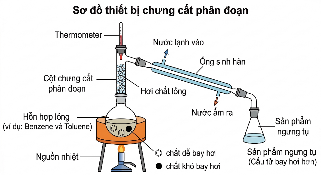 Chưng cất là phương pháp tách và tinh chế các chất lỏng ra khỏi hỗn hợp dựa trên sự khác biệt về nhiệt độ sôi (hoặc áp suất hơi) của chúng. Khi đun nóng hỗn hợp lỏng, chất có nhiệt độ sôi thấp hơn (tức là dễ bay hơi hơn, có áp suất hơi lớn hơn) sẽ hóa hơi nhiều hơn. Hơi thoát ra được dẫn qua ống sinh hàn để ngưng tụ lại thành chất lỏng sạch hơn so với ban đầu.