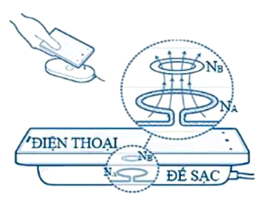 Nguyên lí hoạt động của sạc điện không dây dựa trên hiện tượng cảm ứng điện từ bằng việc sử dụng cuộn dây phát $N_{A}$ (ở đế sạc) và cuộn dây nhận $N_{B}$ (trong thiết bị nhận) như hình sau.
