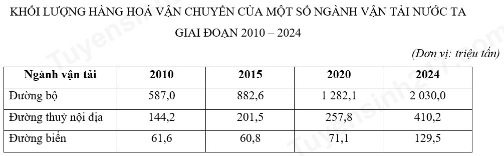 Nhận xét nào dưới đây đúng về khối lượng hàng hoá vận chuyển của một số ngành vận tải nước ta giai đoạn 2010 – 2024?