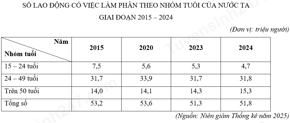 Dựa vào bảng số liệu và nhận xét về sự thay đổi số lao động có việc làm theo nhóm tuổi của nước ta giai đoạn 2015 - 2024.