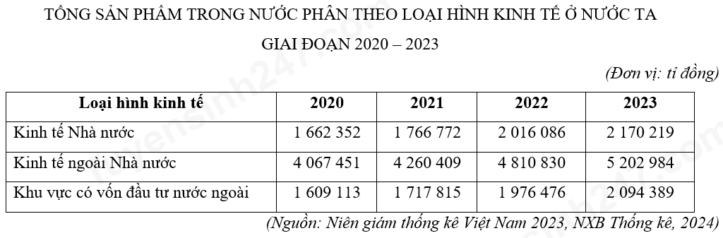 Dựa vào bảng số liệu, hãy cho biết loại loại hình kinh tế nào có tốc độ tăng chậm nhất trong giai đoạn 2020 - 2023?