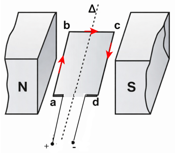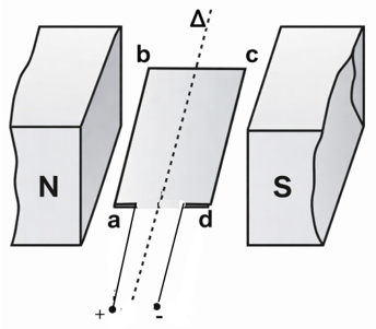 Một động cơ điện gồm một nam châm tạo ra từ trường đều có đường sức từ theo phương ngang và một khung dây dẫn hình chữ nhật có thể quay quanh trục $\Delta$ cố định vuông góc với đường sức từ (hình vẽ).
