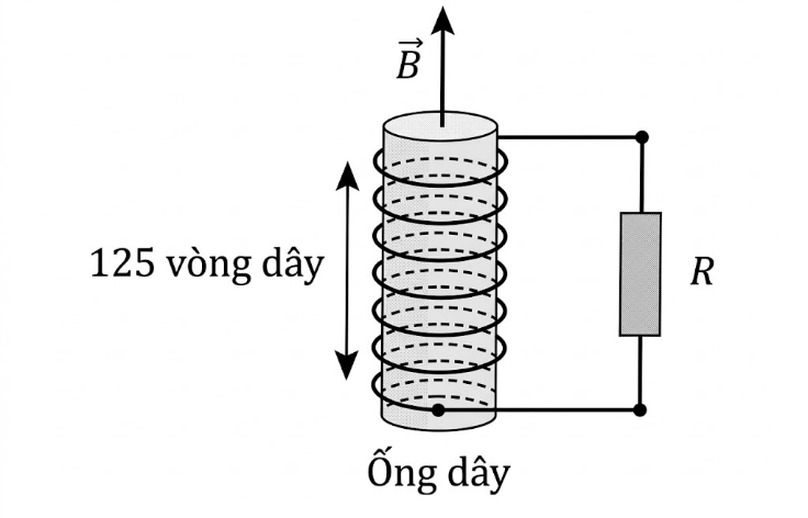 Sử dụng các thông tin sau cho Câu 1 và Câu 2: Một ống dây có diện tích tiết diện $98,0\text{cm}^{2}$ gồm 125 vòng dây được đặt trong một từ trường đều có cảm ứng từ song song với trục của ống dây và có độ lớn $B = 0,150\text{T}$. Ống dây được nối với một điện trở $R$ tạo thành một mạch điện kín với điện trở tổng cộng là $2,40\mspace{6mu}\Omega$. Giữ nguyên độ lớn nhưng đổi chiều của cảm ứng từ. Giải sử thời gian đổi chiều là 0,105 s. Trong thời gian đổi chiều của cảm ứng từ,