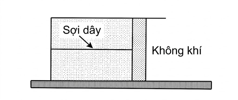 Sử dụng các thông tin sau cho Câu 3 và Câu 4: Bên trong một xi-lanh nằm ngang, cố định, có một lượng khí lí tưởng được ngăn cách với không khí bên ngoài bằng một pit-tông có diện tích tiết diện $32,0cm^{2}$. Bỏ qua ma sát giữa pit-tông và xi-lanh. Một sợi dây không dãn, khối lượng không đáng kể, nối giữa pit-tông và đáy xilanh (hình vẽ). Lúc đầu lượng khí trong xilanh có nhiệt độ $27,0^{0}C$ và áp suất bằng áp suất khí quyển là $1,00.10^{5}Pa$.