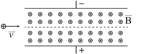 Sử dụng các thông tin sau cho Câu 5 và Câu 6: Z là vùng không gian tồn tại một điện trường đều và một từ trường đều vuông góc với nhau ($\overset{\rightarrow}{E}\bot\overset{\rightarrow}{B}$, hình vẽ). Độ lớn của cường độ điện trường là E = 2,80 kV/m và độ lớn của cảm ứng từ là B = 0,500 T. Một ion dương có khối lượng m = $1,66.10^{- 26}$kg, điện tích $q = 1,60.10^{- 19}$C chuyển động với vận tốc $\overset{\rightarrow}{v}$ vào vùng Z theo phương vuông góc với cảm ứng từ $\overset{\rightarrow}{B}$. Lực từ tác dụng lên ion có độ lớn $\left. F = Bv \middle| q \right|$, có phương vuông góc với cảm ứng từ $\overset{\rightarrow}{B}$ và với vận tốc $\overset{\rightarrow}{v}$. Bỏ qua tác dụng của trọng lực.