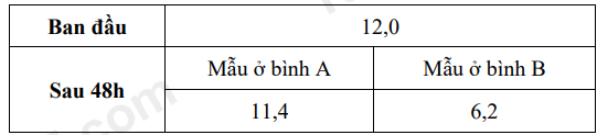 | c) Sau 48 giờ, lượng Vitamin C trong bình B đã bị oxi hóa mất 48,3% so với lượng ban đầu. (Kết quả các phép tính trung gian không được làm tròn, chỉ kết quả cuối cùng được làm tròn đến hàng phần mười.) | ||