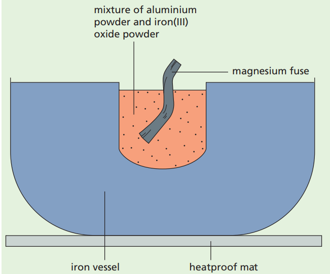 Nhôm, là kim loại hoạt động mạnh hơn, sẽ lấy oxygen từ sắt, kim loại hoạt động yếu hơn. Đây là phản ứng toả nhiệt rất mạnh. Khi phản ứng kết thức, sẽ còn lại khối sắt cùng với bột oxide nhôm màu trắng.