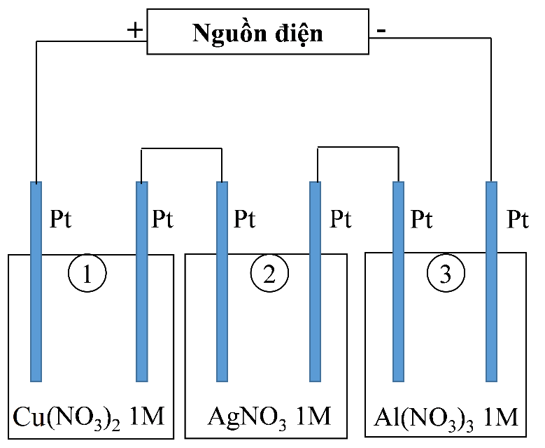 Sau một thời gian, sinh viên quan sát thấy có 3,84 gam kim loại đồng bám lên điệc cực của bình 1. Biết trong hệ điện phân nối tiếp, số điện tử truyền dẫn trong các bình là như nhau. Nguyên tử khối của Ag, Cu và Al lần lượt là 108; 64 và 27 đvC.