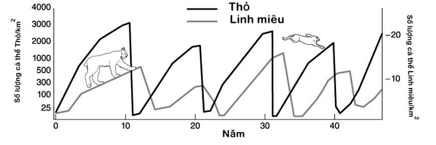 Sơ đồ ở hình bên mô tả sự biến động số lượng cá thể của quần thể thỏ và quần thể linh miêu. Đây là ví dụ minh họa cho kiểu biến động số lượng cá thể nào sau đây?