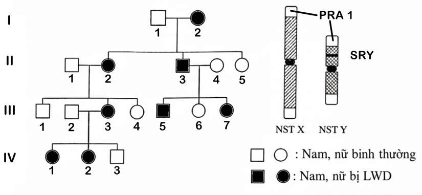 Ở người, chúng loạn sản sụn Leri Weill (LWD) do một allele đột biến của gene SHOX gây nên. Gene này gồm 2 allele, trội - lặn hoàn toàn, nằm trong vùng PAR 1 của nhiễm sắc thể (NST) X và Y. Người mắc LWD thường có tầm vóc thấp do biến dạng xương chân; xương tay cũng có thể bị biến dạng. Sơ đồ phả hệ dưới đây mô tả sự di truyền của LWD trong một gia đình. Qua phân tích, người ta thấy rằng trong quá trình giảm phân hình thành giao tử ở người II.3 đã xảy ra hiện tượng trao đổi đoạn NST nhưng không ảnh hưởng đến gene SRY. Hiện tượng này không xảy ra đối với những người khác trong phả hệ và không xuất hiện các đột biến khác.