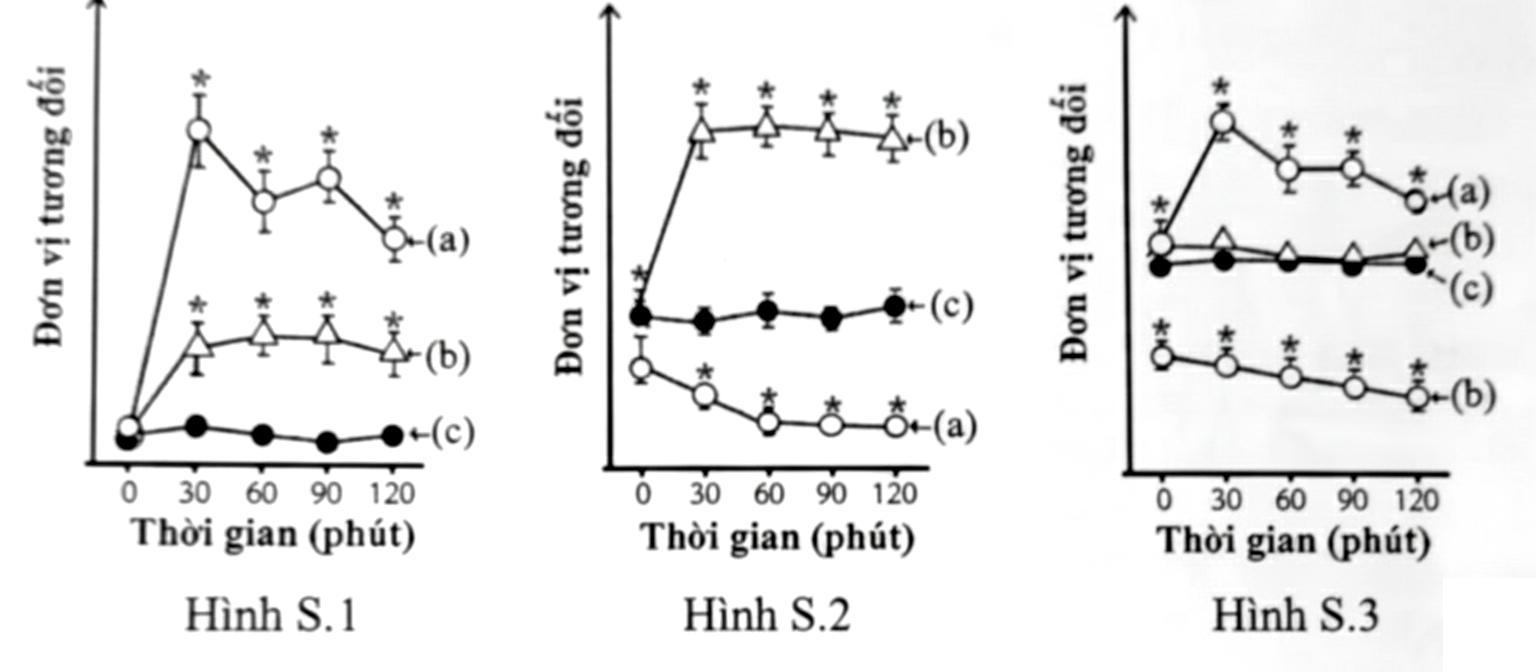 Một nghiên cứu được tiến hành trên chuột nhằm tìm hiểu ảnh hưởng của các chất dinh dưỡng đến hàm lượng glucose, insulin và glucagon trong máu. Chuột khỏe mạnh được chia thành 3 nhóm đồng đều về tuổi, giới tính và khối lượng cơ thể. Mỗi nhóm được cho uống một loại dung dịch chỉ chứa một trong các chất dinh dưỡng: glucose, protein, rotein, lipid. Sau đó, hàm lượng glucose, insulin và glucagon trong máu được phân tích tại các thời điểm khác nhau (30, 60, 90, 120 phút) kể từ thời điểm uống dung dịch dinh dưỡng (0 phút). Hình S.1; S.2 và S.3 thể hiện hàm lượng glucose, insulin và glucagon trong máu của chuột thí nghiệm. Mỗi đường đồ thị [kí hiệu (a), (b), (c)] biểu thị một nhóm chuột uống một loại dung dịch dính dưỡng. Dấu (*) thể hiện sự khác biệt có ý nghĩa thống kê giữa giá trị tại mỗi thời điểm phân tích so với thời điểm 0 phút trên cùng một đường đồ thị.