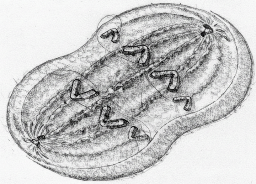 - Ở một phía của tế bào, có 4 cụm/nhóm NST đơn đang tách ra.