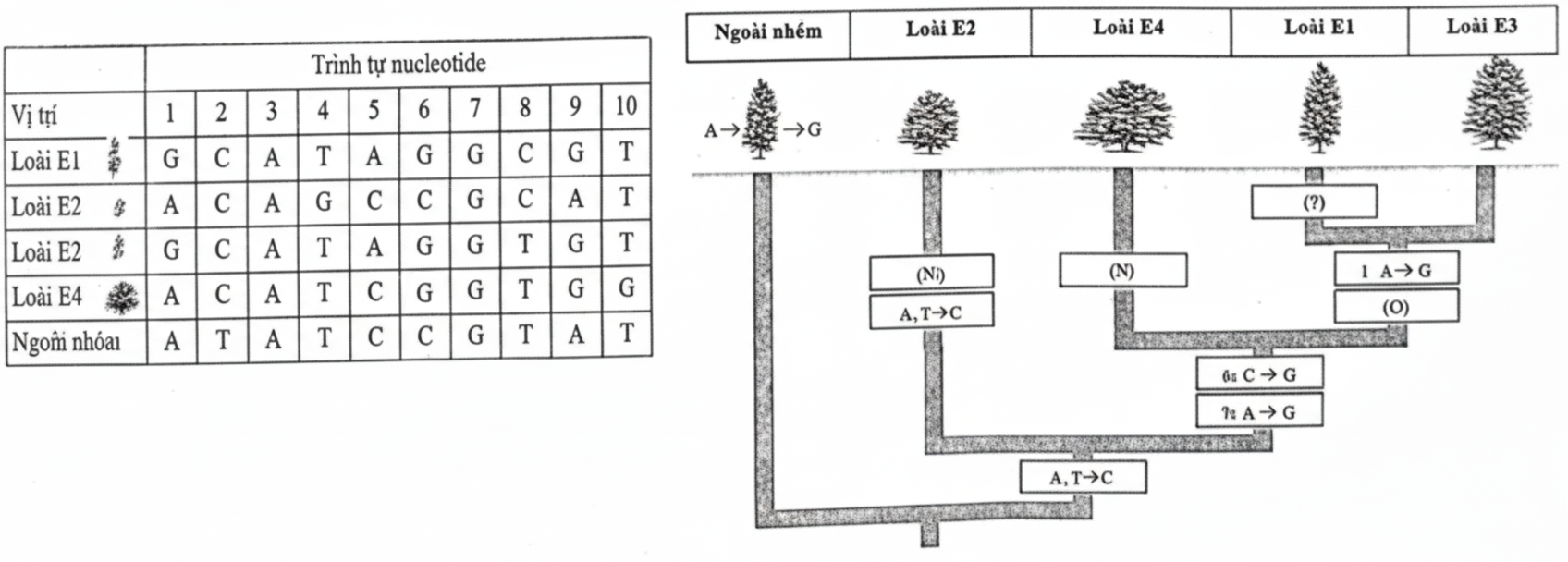 - Loài E2: A A A G C C G C A T (So sánh với ngoài nhóm: 1: A→A (giữ nguyên), 2: T→A, 4: T→G, 5: C→C, 6: C→G...)