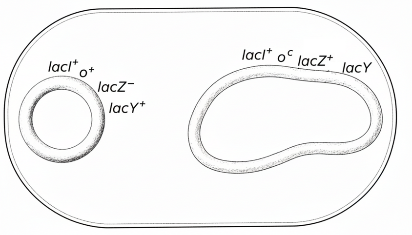 Để giải quyết bài toán về operon Lac trong tế bào vi khuẩn E. coli này, chúng ta cần phân tích kỹ cấu trúc di truyền của cả nhiễm sắc thể (NST) và plasmid: