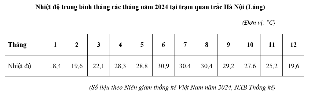 Căn cứ vào bảng số liệu trên, hãy cho biết biên độ nhiệt độ không khí trung bình của năm 2024 tại trạm quan trắc Hà Nội là bao nhiêu °C (Làm tròn kết quả đến một chữ số thập phân).