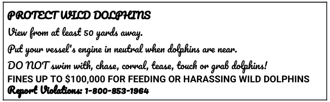 Thông tin từ hình ảnh: "PROTECT WILD DOLPHINS. View from at least 50 yards away. Put your vessel's engine in neutral... DO NOT touch or grab... FINES... FOR FEEDING..."
