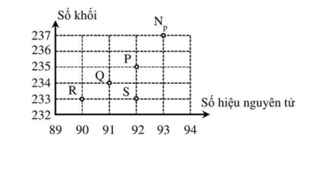 Sơ đồ bên cho thấy số khối A và số hiệu nguyên tử Z của một số hạt nhân. Đồng vị của neptunium (Np) phân rã bằng cách phát ra một hạt $\alpha$ và sau đó là một hạt $\beta^{-}$. Kí hiệu nào sau đây trên sơ đồ bên đại diện cho hạt nhân thu được?