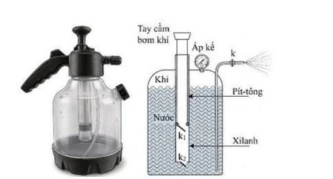| a) Bình phun nước tưới cây hoạt động dựa trên nguyên lý nén khí, sử dụng bơm tay để nén không khí vào bình kín, tạo áp suất cao đẩy nước qua vòi phun. | ||