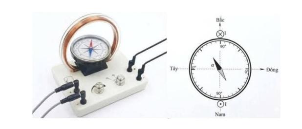 Một nhóm học sinh trường THPT Lương Thế Vinh – Hà Nội tiến hành thí nghiệm đo độ lớn thành phần nằm ngang của cảm ứng từ Trái Đất. Các bạn ấy lựa chọn bộ thí nghiệm trong phòng thí nghiệm Vật lý của trường gồm: khung dây tròn có đường kính 20 cm, gồm 100 vòng dây, kim nam châm la bàn đặt nằm ngang ở tâm của khung dây, nguồn điện một chiều cấp dòng điện ổn định có cường độ 25 mA cho khung dây. Ban đầu chưa có dòng điện, điều chỉnh khung dây sao cho trục nối hai cực của kim nam châm trùng với đường kính của khung dây. Cho dòng điện chạy vào khung dây có chiều như hình vẽ, khi đó kim nam châm lệch so với hướng Đông - Tây góc $\alpha = 60^{0}$. Biết rằng độ lớn cảm ứng từ do dòng điện chạy trong khung dây tròn tạo ra ở tâm được tính theo công thức: $B_{0} = 2\pi \cdot 10^{- 7} \cdot \dfrac{NI}{R}\text{~(T)}$, trong đó N là số vòng dây, R là bán kính của khung dây; I là cường độ dòng điện.