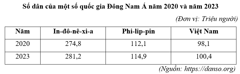 | d) Năm 2023 so với năm 2020, số dân của Phi-li-pin tăng nhiều nhất. |