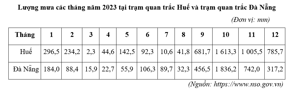Căn cứ vào bảng số liệu trên, hãy cho biết năm 2023, tổng lượng mưa tại trạm quan trắc Đà Nẵng thấp hơn tổng lượng mưa tại trạm quan trắc Huế là bao nhiêu mm (làm tròn kết quả đến hàng đơn vị).