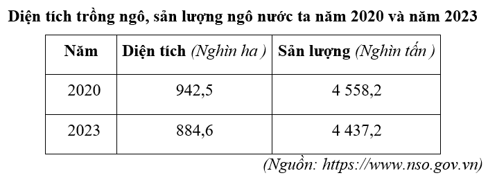 Căn cứ vào bảng số liệu trên, hãy cho biết năng suất ngô của nước ta năm 2023 so với năm 2020 tăng thêm bao nhiêu tạ/ha (làm tròn kết quả đến một chữ số thập phân).