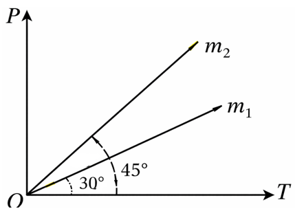 Hai bình có thể tích bằng nhau, chứa cùng một loại khí (coi là khí lí tưởng) có khối lượng $m_{1}$ và $m_{2}$. Đồ thị biến đổi áp suất theo nhiệt độ tuyệt đối của khí trong hai bình biểu diễn như hình bên. Tỉ số $\dfrac{m_{1}}{m_{2}}$ bằng bao nhiêu? (kết quả làm tròn và viết đến hai chữ số thập phân).
