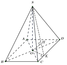 Để tính $d(O,(SCD))$, ta xác định hình chiếu vuông góc của O lên mặt phẳng $(SCD)$.