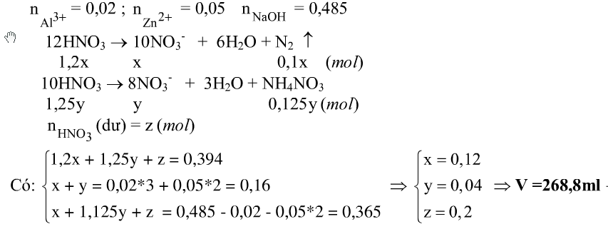 Hòa tan hoàn toàn 3,79 g hỗn hợp X gồm Al và Zn ( có tỉ lệ số mol tương ứng là 2:5 ) vào dung dịch chứa 0,394 mol HNO3 thu được dung dịch Y và V ml ( đktc) khí N2 duy nhất . Để phản ứng hết với các chất trong Y thu được dung dịch trong suốt cần 3,88 lít dung dịch NaOH 0,125M . Giá trị V là