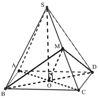 Cho hình chóp tứ giác đều $S.ABCD$, có đáy $ABCD$ là hình vuông tâm $O$. Các cạnh bên và các cạnh đáy đều bằng $a$. Gọi $M$ là trung điểm $SC$. Tính góc giữa hai mặt phẳng $\left( {MBD} \right)$ và $\left( {ABCD} \right)$
