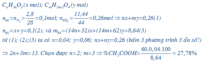 Hóa hơi 8,64g hỗn hợp 1 axit no đơn chức mạch hở X và 1 axit no đa chức Y(có mạch cacbon hở , không phân nhánh) thu được 1 thể tích hơi bằng thể tích của 2,8 g N2 trong cùng điều kiện nhiệt độ và áp suất. Đốt cháy hoàn toàn 8,64g hỗn hợp nói trên được 11,44g CO2. % khối lượng của X trong hỗn hợp ban đầu là: