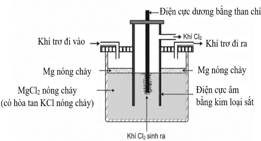 Trong công nghiệp, kim loại magnesium (Mg) được sản xuất từ quặng carnalite (có thành phần chính là (KCl.MgCl2.6H2O) bằng phương pháp điện phân nóng chảy. Trước khi điện phân, carnalite được nung nóng để loại bỏ nước. Khi điện phân, KCl có vai trò hạ nhiệt độ nóng chảy của hỗn hợp, giúp giảm chi phí sản xuất. Sơ đồ thiết bị quá trình điện phân được mô tả như hình dưới đây: