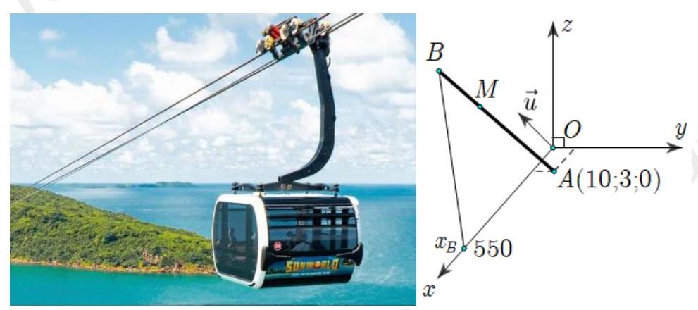 Một cabin cáp treo xuất phát từ điểm $A\left( {10;3;0} \right)$ và chuyển động đều theo đường cáp có vectơ chỉ phương là $\overset{\rightarrow}{u} = \left( {2; - 2;1} \right)$ với tốc độ là $4,5\left( {\text{m}/\text{s}} \right)$ (đơn vị trên mỗi trục tọa độ là mét) được mô hình hóa như các hình vẽ sau: