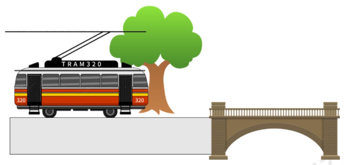 Một đoàn tàu đứng yên trong sân ga, ngay trước đầu tàu có một cái cây. Đoàn tàu khởi hành