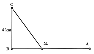 Một đường dây điện được nối từ một nhà máy điện ở A đến một hòn đảo ở C như Hình 1.40. Khoảng cách từ C đến B là 4 km. Bờ biển chạy thẳng từ A đến B với khoảng cách là 10 km. Tổng chi phí lắp đặt cho 1 km dây điện trên biển là 50 triệu đồng, còn trên đất liền là 30 triệu đồng. Biết rằng có vị trí điểm M trên đoạn AB (điểm nối dây từ đất liền ra đảo) để tổng chi phí lắp đặt là nhỏ nhất, tính độ dài BM (đơn vị kilômét).