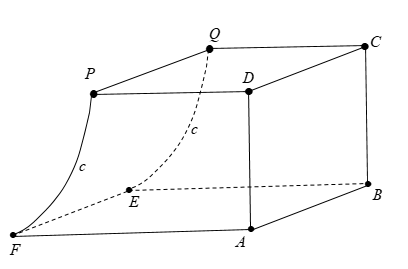 Các tứ giác $ABCD,CDPQ$ là các hình vuông cạnh $2,5\, cm$. Tứ giác $ABEF$ là hình chữ nhật có $BE = 3,5\, cm$. Mặt bên$PQEF$được mài nhẵn theo đường parabol $(P)$ có đỉnh parabol nằm trên cạnh $EF.$ Thể tích của chi tiết máy bằng bao nhiêu đơn vị $cm^{3}$ (kết quả làm tròn đến chữ số đầu tiên hàng thập phân)?