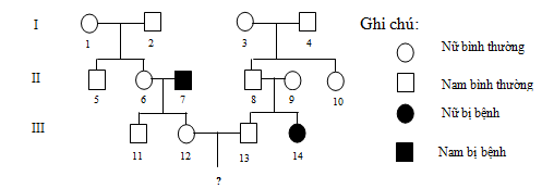 Sơ đồ phả hệ sau đây mô tả một bệnh di truyền ở người do một alen lặn nằm trên NST thường quy định, alen trội tương ứng quy định không bị bệnh. Biết rằng không có các đột biến mới phát sinh ở tất cả các cá thể trong phả hệ. Xác suất sinh con đầu lòng không bị bệnh của cặp vợ chồng III.12 và III.13 trong phả hệ này là