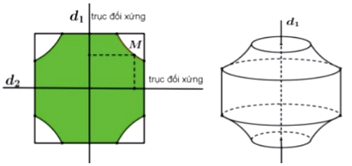 Có một hình phẳng $(H)$ (phần tô đậm trong hình vẽ bên) được tạo ra bằng cách vẽ một hình vuông có cạnh bằng 4. Sau đó, ở bốn góc hình vuông đó vẽ bốn đường cong đều có tính chất là: tích khoảng cách từ một điểm bất kì thuộc mỗi đường cong đó đến hai trục đối xứng $d_{1},d_{2}$ của hình vuông bằng 2. Khi cho hình phẳng $(H)$ quay quanh trục $d_{1}$, ta sẽ thu được một vật thể tròn xoay, thể tích vật thể tròn xoay đó bằng bao nhiêu (không làm tròn kết quả các phép tính trung gian, chỉ làm tròn kết quả cuối cùng đến hàng phần chục)?