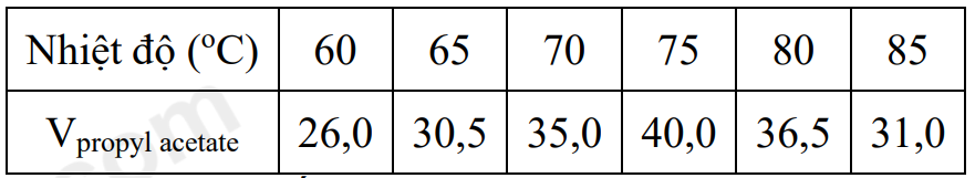Lặp lại thí nghiệm trên, chỉ thay đổi nhiệt độ ở bước 2 lần lượt là 65 oC; 70 oC; 75 oC; 80 oC; 85 oC. Nhóm học sinh ghi lại thể tích propyl acetate thu được ở bảng sau: