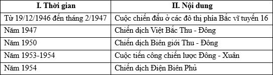 | b) Các chiến dịch quân sự của quân dân Việt Nam trong giai đoạn 1946 - 1954 đều đánh bại âm mưu đánh nhanh thắng nhanh của Pháp. | ||