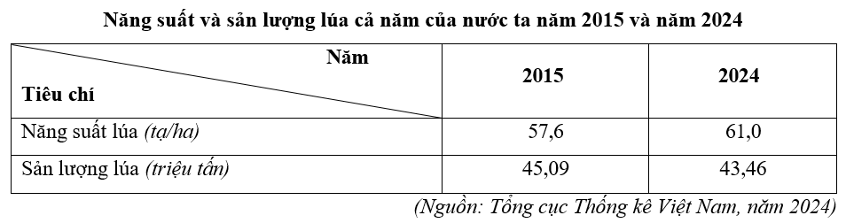 Căn cứ vào bảng số liệu trên, hãy cho biết diện tích lúa của nước ta năm 2024 so với năm 2015 giảm bao nhiêu triệu ha (làm tròn kết quả đến một chữ số thập phân).