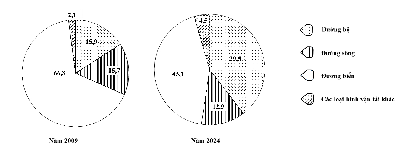 Dựa vào biểu đồ và lựa chọn nhận xét đúng về sự thay đổi tỉ trọng khối lượng hàng hóa luân chuyển phân theo ngành vận tải năm 2009 và năm 2024.
