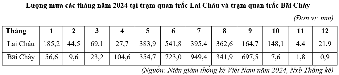 Căn cứ vào bảng số liệu trên, hãy cho biết năm 2024, lượng mưa của tháng có lượng mưa thấp nhất tại trạm quan trắc Lai Châu cao hơn lượng mưa của tháng có lượng mưa thấp nhất tại trạm quan trắc Bãi Cháy là bao nhiêu mm (làm tròn kết quả đến một chữ số thập phân).