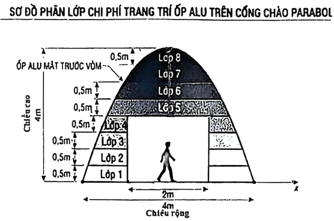Để chuẩn bị cho lễ hội, một đơn vị thi công dựng một cổng chào dạng vòm Parabol có chiều cao 4 m và chiều rộng chân cổng là 4 m. Ở chính giữa cổng, người ta thiết kế một lối đi hình chữ nhật cao 2 m và rộng 2 m. Phần diện tích mặt trước của cổng Parabol (sau khi đã trừ lối đi hình chữ nhật) được chia thành 8 lớp ngang, mỗi lớp cao 0,5 m để ốp tấm nhôm Alu trang trí có màu khác nhau (như bản vẽ thiết kế hình bên dưới).
