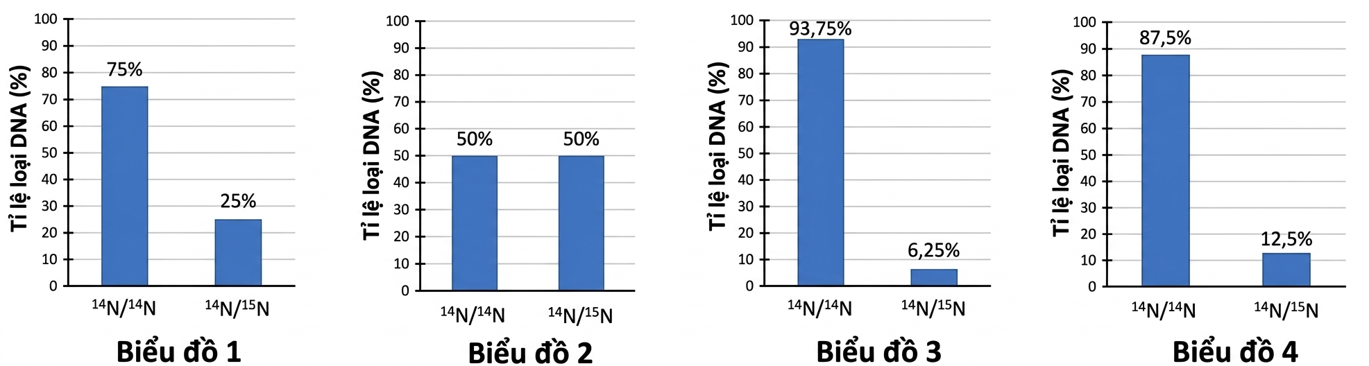 Vi khuẩn E. coli là sinh vật có cấu tạo đơn bào. Trong tế bào vi khuẩn, ở vùng nhân có 1 phân tử DNA mạch kép dạng vòng. Sau mỗi thế hệ sinh sản theo kiểu phân đôi, từ 1 tế bào vi khuẩn “mẹ” sẽ hình thành 2 tế bào vi khuẩn mới. Để chứng minh DNA tái bản theo nguyên tắc bán bảo toàn, một nhóm sinh viên đã thực hiện thí nghiệm như sau: - Nuôi vi khuẩn E. coli ở môi trường chứa nucleotide tiền chất được đánh dấu bằng đồng vị phóng xạ nặng 15N qua một số thế hệ; - Chuyển vi khuẩn chỉ chứa DNA mang 15N sang nuôi ở môi trường chỉ chứa đồng vị phóng xạ nhẹ 14N; - Tách chiết và phân tích DNA của vi khuẩn sau mỗi thế hệ nuôi ở môi trường chỉ chứa 14N. Kết quả phân tích DNA của vi khuẩn nuôi ở môi trường chỉ chứa 14N qua các thế hệ nuôi cấy được trình bày ở các biểu đồ dưới đây.