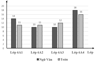 Biểu đồ cột kép trong hình bên biểu diễn số học sinh giỏi hai môn Ngữ văn và Toán của bốn lớp khối 6 gồm: 6A1; 6A2; 6A3; 6A4.