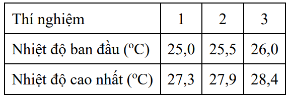 Bước 2: Cho 0,5 gam bột Mg vào ống đầu tròn và ghi lại giá trị nhiệt độ cao nhất của nhiệt kế sau thí nghiệm. Thí nghiệm được lặp lại thêm hai lần nữa. Kết quả được thể hiện qua bảng sau: