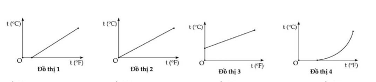 Các hình vẽ bên là đồ thị biểu diễn mối liên hệ giữa kết quả đọc được từ nhiệt giai Celsius và nhiệt giai Fahrenheit của một vật. Đồ thị đúng là: