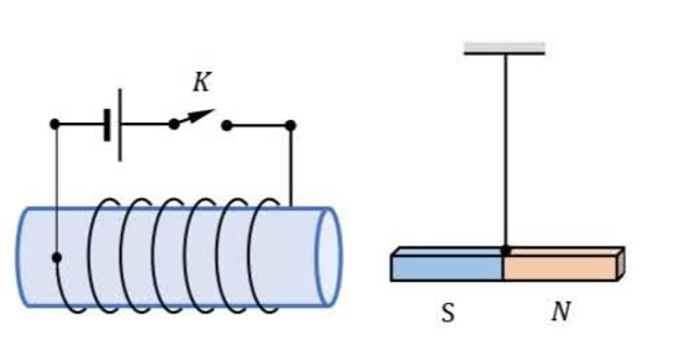 Cho sơ đồ mạch điện như hình vẽ. Nam châm được treo bởi một sợi dây. Khi khóa K đóng thì